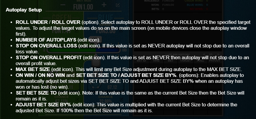 เกมนี้มาพร้อมฟีเจอร์ Auto Play ที่ช่วยให้ผู้เล่นตั้งจำนวนรอบเดิมพันอัตโนมัติ พร้อมกำหนดขีดจำกัดการแพ้และการชนะ เพื่อควบคุมการเล่นได้อย่างปลอดภัย โหมด Turbo Play จะช่วยเพิ่มความเร็วในการหมุนลูกเต๋า เหมาะสำหรับผู้เล่นที่ต้องการเกมจบไว และยังมีหน้าสถิติย้อนหลังมากกว่า 500 รอบ เพื่อใช้วิเคราะห์แนวโน้มของผลลัพธ์ก่อนเดิมพัน