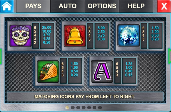 กลุ่มสัญลักษณ์พรีเมียมและทั่วไป สัญลักษณ์ในเกมออกแบบมาให้เข้ากับธีมร็อกยุค 2000 อย่างลงตัว สัญลักษณ์จ่ายต่ำคือ A, K, Q, J, 10, 9 ที่มาในโทนนีออน ส่วนสัญลักษณ์พรีเมียมประกอบด้วย ระฆังทอง, ลูกบอลดิสโก้, และ ทาโก้รสจัดจ้าน ซึ่งให้รางวัลสูงกว่าปกติหลายเท่า โดยเฉพาะสัญลักษณ์ หัวกะโหลก Dia de Muertos Skull ที่เป็นสัญลักษณ์พรีเมียมสูงสุดของเกม สามารถมอบเงินรางวัลสูงสุดได้เมื่อปรากฏหลายตัวพร้อมกัน การออกแบบที่ผสมผสานกลิ่นอายเม็กซิกันกับความร็อกทำให้ทุกครั้งที่วงล้อหยุดหมุนมีความรู้สึกเหมือนอยู่ในงานเทศกาลดนตรีเต็มรูปแบบ