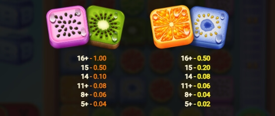 กลุ่มสัญลักษณ์ภายในเกมมีทั้งแบบพรีเมียมและสัญลักษณ์ทั่วไปตามแนวสล็อตผลไม้ โดยสัญลักษณ์แตงโมคือสัญลักษณ์ที่ให้รางวัลสูงสุด รองลงมาเป็นแก้วมังกร กีวี บลูเบอร์รี่ และส้ม ส่วนสัญลักษณ์มะนาวและผลไม้สีแดงจัดเป็นกลุ่มรางวัลต่ำที่ออกบ่อยเพื่อช่วยเพิ่มโอกาสการทำคลัสเตอร์ นอกจากนี้ยังมีสัญลักษณ์ Wild ที่ช่วยแทนค่าให้กับสัญลักษณ์ทั้งหมด และ Scatter ที่เป็นประตูสู่รอบฟรีสปิน ฟีเจอร์ Jumbo Symbol ซึ่งเป็นสัญลักษณ์ขนาดใหญ่ตั้งแต่ 2×2 ถึง 4×4 ยังช่วยเพิ่มการเชื่อมต่อของคลัสเตอร์ให้เกิดรางวัลก้อนโตได้ง่ายขึ้น