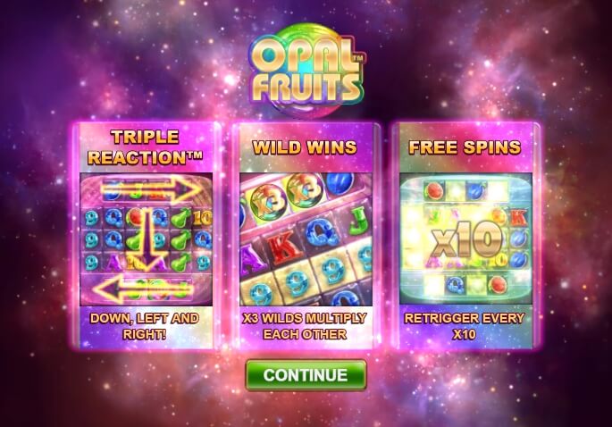 หนึ่งในจุดเด่นที่ทำให้ Opal Fruits ได้รับความนิยมคือระบบ Triple Reaction ที่จะทำงานทุกครั้งเมื่อเกิดการชนะ สัญลักษณ์ที่ชนะจะหายไปและเปิดทางให้สัญลักษณ์ใหม่จากรีลบนและล่างไหลเข้ามาแทน ระบบนี้สามารถทำคอมโบต่อเนื่องได้หลายครั้งในรอบเดียว รวมทั้งช่วยให้ตัวคูณสะสมในระหว่างรอบฟรีสปินเพิ่มขึ้นเรื่อยๆ นอกจากนี้ยังมีฟีเจอร์ Free Spins ที่เริ่มต้นเมื่อได้ Scatter ครบสี่ตัว ให้หมุนฟรี 10 ครั้งพร้อมตัวคูณไม่จำกัดที่เพิ่มทุกครั้งที่เกิด Reaction ทำให้มีโอกาสระเบิดรางวัลใหญ่แบบทวีคูณจนถึงระดับสูงสุดที่ 36,000 เท่า